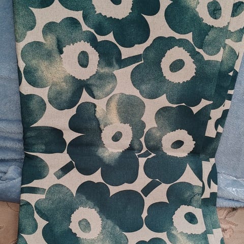 Myydään Marimekon vihreät akvarelli unikko -kuosiset kankaat. Ostettu verhoksi, mutta olikin väärä pituus. Sopii siis verhoksi tai pöytäliinaksi tai vaikka päiväpeitoksi. Puuvillan ja pellavansekoitetta, vahvaa kangasta.