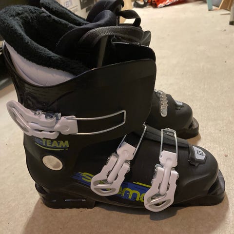 Salomon Team laskettelumonot, koko 23.0. Monot ovat mustat, joissa on valkoisia ja keltaisia yksityiskohtia sekä kolme säädettävää solkea. Pohjissa on kulutusta kestävät kumiosat. Sopivat lasketteluun esimerkiksi lapselle tai nuorelle, jonka jalankoko vastaa 23.0 mondo-mittaa.