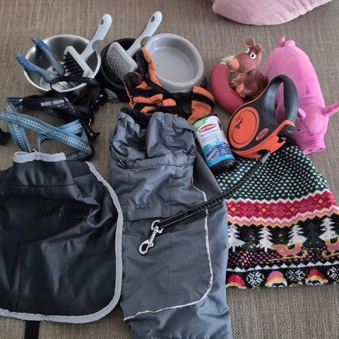 Paketissa erilaisia koiratarvikkeita esim. pentua hankkivalle. Mukana mm. eri kokoisia takkeja ja kulhoja, kynsisakset, älypeli, matkavesipullo, koulutuksessa käytettävä naksutin, tassupyyhkeitä, turvavyö autoon, ladattava valopanta (tämän toimivuudesta en mene takuuseen) jne. Pesu jää ostajalle. Myydään pakettina.