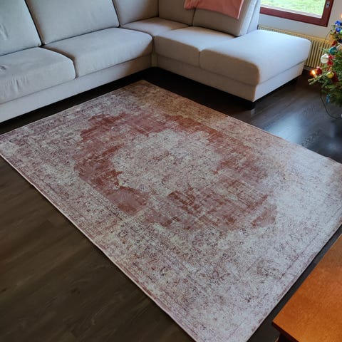 Vallila Topaasi-matto. Kuviollinen, roosan sävyinen matto, jossa kulutettua pintaa muistuttava koristeellinen kuviointi. Pohjassa on liukuestepinta.