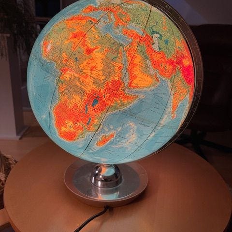 Globe Scan-globe A / S Denmark 1950s. 50-60 luvun taittesta. paperipintainen. pieni lommo/reikä Ranskan kohdalla. Toimiva harvinainen.Neuvostoliitto ym sen ajan maat. kuvassa siis tuo oikeanpuoleinen maapallo.