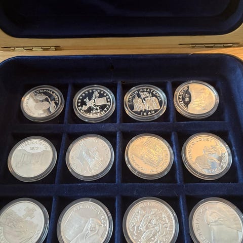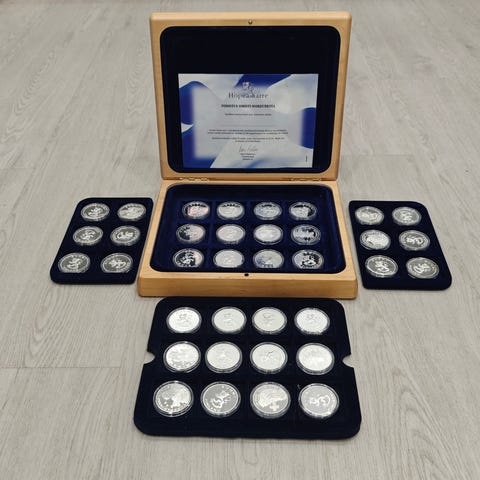 Suomen hopea aarre alkuperäisessä puulaatikossaan todistuksineen.