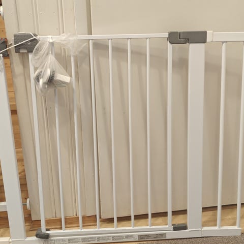 Koiraportti on 50 cm korkea. Leveys on säädettävissä välillä 65-108 cm. Käytön jälkiä on, mutta ei vaikuta portin toimivuuteen. Ei tarvitse kiinnittää ovenkarmeihin.