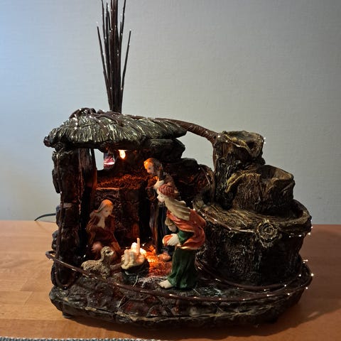 Myydään seimi-kuvaelmaa kuvaava patsas. Korkeus 34 cm ja leveys 20 cm.