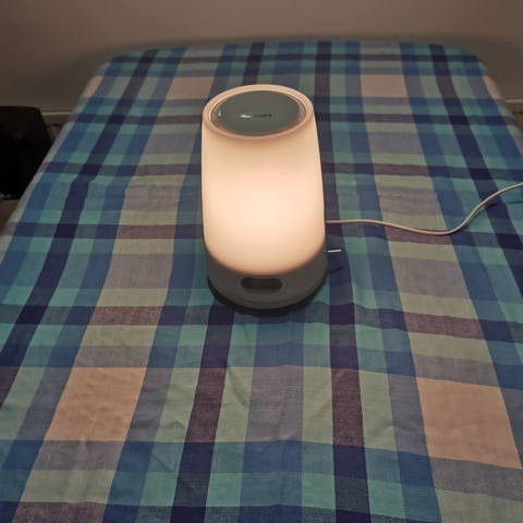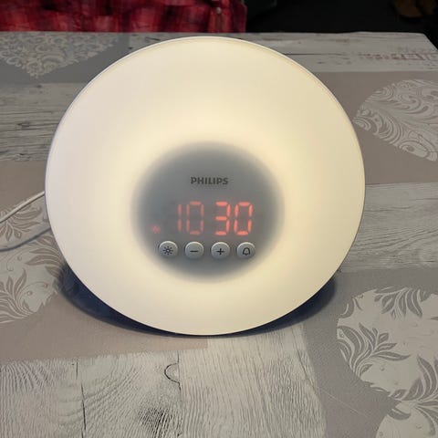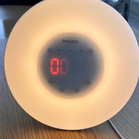 Philips Wake-up Light -herätysvalo. Laite simuloi auringonnousua lisäämällä valon kirkkautta asteittain ennen herätysaikaa. Herätysvalossa on useita valoasetuksia ja mahdollisuus valita erilaisia herätysääniä tai radion. Laitetta voidaan käyttää myös tavallisena pöytä- tai yölampun kaltaisena valonlähteenä. Soveltuu käytettäväksi makuuhuoneessa heräämisen helpottamiseen ja valaistuksen säätelyyn.