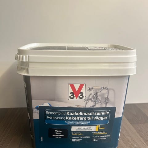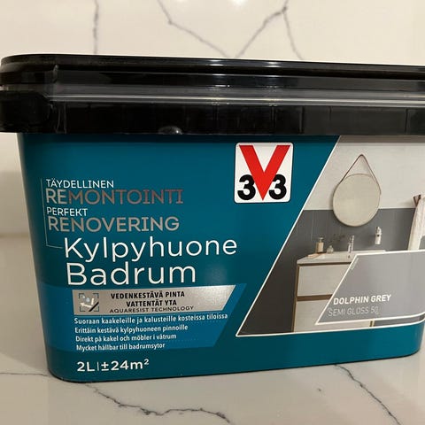 Bauhaussista ostettu, täysin avaamaton 3V3 kylpyhuoneen erittäin kestävä (vedenkestävä) maali kaikille kylpyhuoneen pinnoille ja kalusteille.