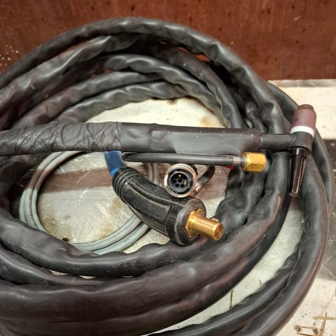 Tig polttimen jatkokaapeli. 8 metriä. Kuvassa näkyy pistoke mihin kaapeliin käy.