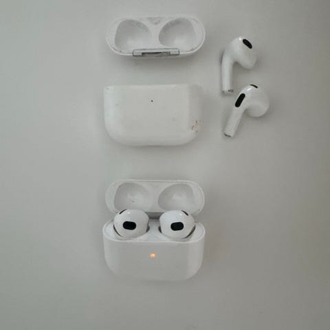 Apple AirPods langattomat kuulokkeet valkoisena. Mukana latauskotelo ja Lightning–USB-latauskaapeli. Kuulokkeet yhdistyvät langattomasti yhteensopiviin Apple-laitteisiin. Latauskotelo suojaa ja lataa kuulokkeita, ja sitä voidaan ladata mukana tulevalla kaapelilla. Soveltuvat musiikin kuunteluun, puheluihin ja muuhun äänentoistoon yhteensopivilla laitteilla.