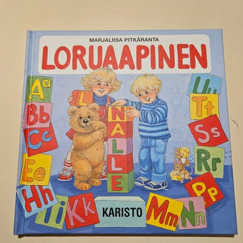 Karisto Loruaapinen lastenkirja. Kovakantinen kuvakirja, jossa on värikkäät kuvitukset ja loruja sekä aakkosiin liittyviä sanoja. Kirja sopii lapsille aakkosten ja kielen harjoitteluun yhdessä aikuisen kanssa.