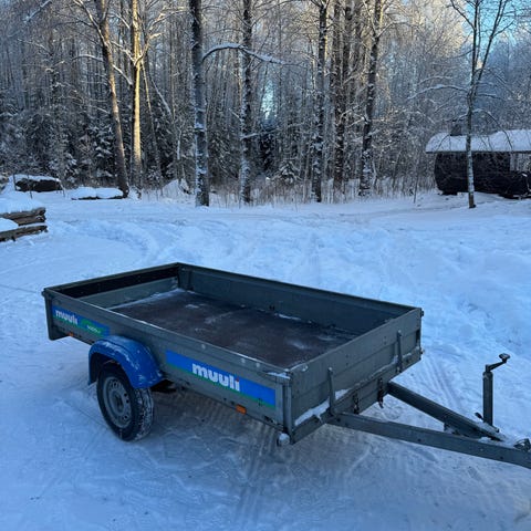 Te-Ho merkkinen kärri. Vm. -98. Koko 3000×1300, pohjavaneri ehjä. Kiinnityslenkit sisäpuolella, 30 cm. korkeat laidat, etu-/takalaita + kuomu irroitettavissa, ei kippiä. Tulee kepeästi auton perässä.