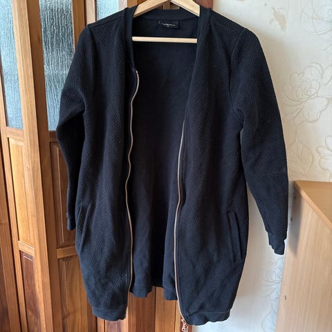 Aarre-merkkinen naisten collegeneuloksinen takki koossa M. Väri musta. Materiaalina pääosin puuvilla, mukana hieman elastaania. Pitkällä, ruusukullan värisellä vetoketjulla edestä suljettava bombermalli, jossa pyöreä pääntie ja pitkät hihat. Pinnan struktuuri on kevyesti kohokuvioitu.