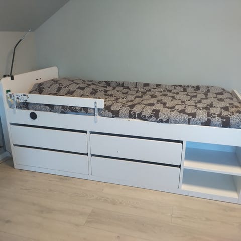 IKEA Släkt sänky jossa levitettävä alasänky ja kaksi säilytyslaatikkoa.
