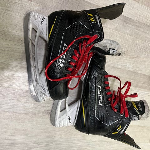 Bauer M1 jääkiekkoluistimet lapsille, koko 33. Väri musta-keltainen, hyväkuntoiset Tuuk Light Speed terät. Kenkäergonomia auttaa luistelun kehittymisessä.