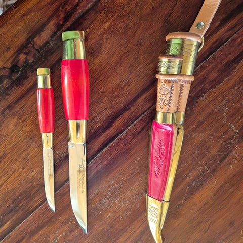 Vesivärimaalattu sorkokuva, uniikki, käsintaottu terä mestariseppä Y. Puronvarsi takoma, valmistettu 1994. Tätä saksanhirvmaalauksella valmistettua tehty/maalattu ainoastaan yksi kappale. Tieto saatu valmistajalta Simo Passilta 29.12.2023.