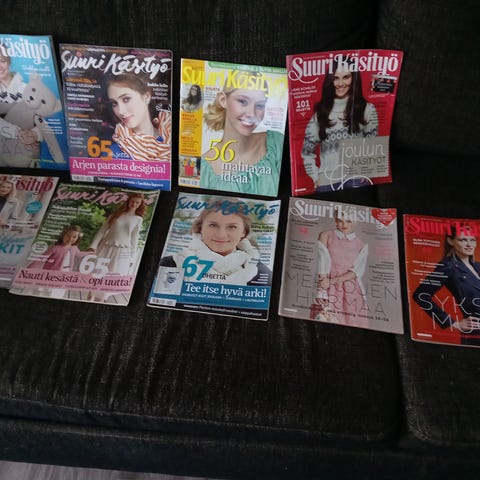 Suuri Käsityö lehdet, sekä 1 kauppa ja koti lehti. Lehdissä on neule-, ompelu- ja käsityöohjeita sekä malleja eri vuodenaikoihin ja koko perheelle. Vanhimmat lehdet 1976 vuodelta. Lehdet siis vuosilta 76,85,86,88,93,94 &95. Kunto vaihtelee, mutta 2€/kpl/ tarjous.