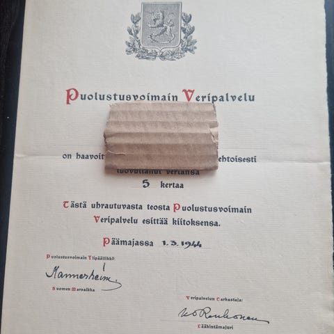 Mannerheimin allekirjoituksella ja sinettileimalla varustettu kunniakirja sotiemme sankareille.Nimetty (nimi peitetty).Tarjoa!!!!!