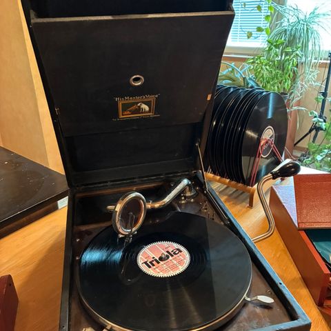 Kuvan HMV gramofoni ja n. 10 kpl levyjä. Ei kokeiltu, neulapussi mukaan.