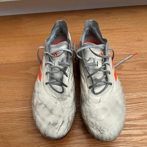 Adidas jalkapallokengät nappulapohjalla. Väri musta. Koko EU 45 ⅓ (US 11, UK 10½, JP 290, CHN 280). Kengissä on synteettinen päällinen ja ulkopohjassa kiinteät nappulat, jotka soveltuvat luonnonnurmelle tai keinonurmelle. Nauhakiinnitys. Valmistusmaa Kambodža.