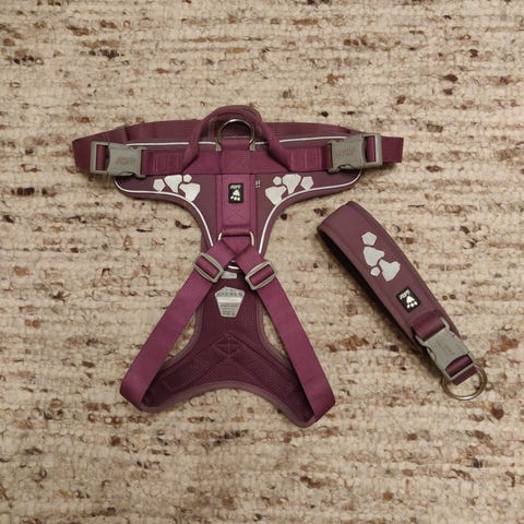 Lujatekoiset, nahkaiset pulkanvetovaljaat teetetty aikanaan saksanpaimenkoiralle eli koko on säädettävä XL. Vähäisessä käytössä olleet, kaulassa pehmuste. Kuvassa puettu Eero Aarnion isomman Puppyn päälle muodon avaamiseksi.