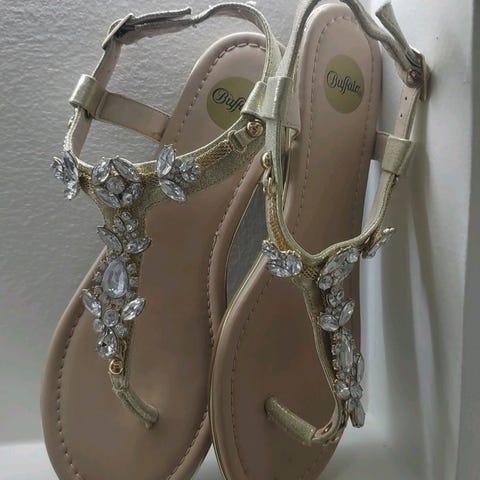 Buffalo remmisandaalit, koko 41. Väri hopea. Matalapohjainen malli useilla ohuilla remmeillä, joissa koristekiviä. Avokärkinen ja nilkan ympäri kulkeva remmi. Sopivat esimerkiksi arki- ja juhlakäyttöön. Olleet vain kerran jalassa. Säilytyksessä osa kivistä irronnut (katso kuva).