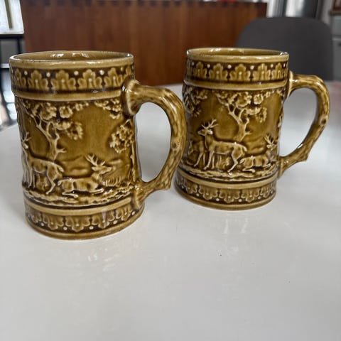 Arabia muki, jossa ruskea lasite ja kohokuvioitu metsä- ja eläinaiheinen koriste. Muki sopii juomien tarjoiluun ja käyttöön arjessa tai osaksi kokoelmaa. Valmistettu keramiikasta.