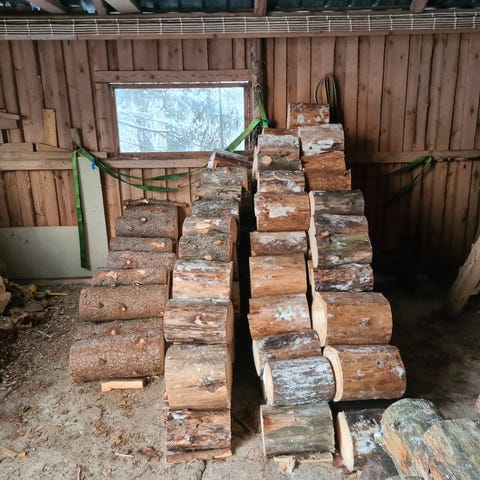 Nokkakärry + kottikärryt löytyvät pölkkyjen siirtämistä varten.