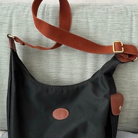 Tyylikäs tummansininen Longchamp-kangasolkalaukku shoppailuun. Nahkaiset vahvikkeet. Sisällä vetoketjullinen tasku.