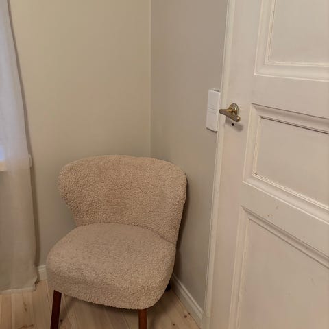 Uusi, vain nurkassa kasattuna nököttänyt tuoli.