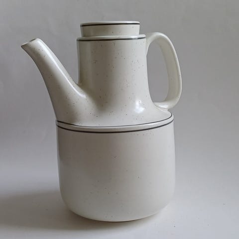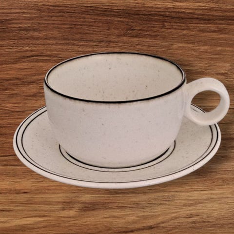 Arabia Birka tee-ja kahvikupit valkoista kivitavaraa. Kupit ovat ulkopuolelta ja sisältä vaaleat, hennolla pilkutuksella ja ohuella tummalla reunaraidalla. 2/5 kupeissa pohjakuvio tasainen, 3/5 valkosempi pohja ja pilkutus runsaampi reunoilla. Eri erää kenties alunperin(?) Pohjassa leima. Arabia Birka -kahvikuppi, jonka on suunnitellut Stig Lindberg. Tuotantoaika on ollut noin vuosina 1995–2003. Kupin halkaisija noin 8 cm ja korkeus 5,5 cm.