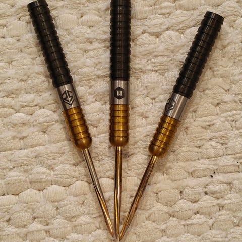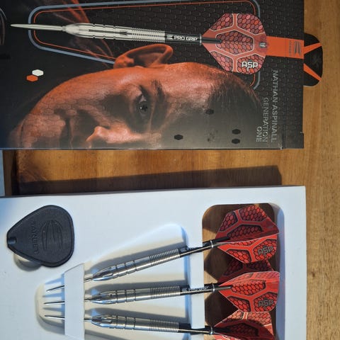 Myydään muutaman tunnin heitetyt Unicorn Gary Anderson W.C. Phase 3 90% darts tikat. Alkuperäinen paketti ja käyttämättömät alkuperäiset sulat ja varret. Tikoilla painoa 25 g.