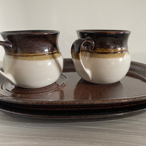 2 kpl mukeja ja lautasia, Kerman saven kultaperho. Astiat ovat beigeä keramiikkaa ja niissä on maalattu kukkakoriste. Lautasissa on erillinen syvennys kupille. Sopii esimerkiksi kahvi- tai teehetkiin kahdelle hengelle.