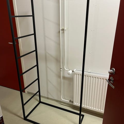 Säätöjalkainen vaate- ja tankoteline sisäkäyttöön. Telineessä on mustat pystytolpat ja jalusta sekä vaalea vaakasuuntainen tanko vaatteiden ripustamiseen henkareilla. Korkeutta voidaan säätää pystytolppien liukusäätimillä. Sopii esimerkiksi makuuhuoneeseen tai vaatehuoneeseen lisäsäilytystilaksi takeille, paidoille ja muille ripustettaville vaatteille.