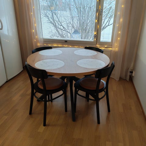 Myydään loppuvuodesta maskusta ostettu ruokapöytä pois muuton takia! Toimituksessa ottanut pienen kolhun, muuten hyvässä kunnossa! Voi tulla paikanpäälle katsomaan, vain nouto. Suosittelen että pöydän kuljettaa kokonaisena eikä rupea turhaan irroittamaan jalkaa. Kysymällä lisätietoa!