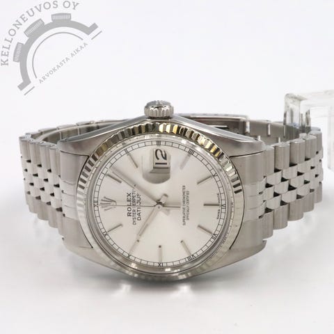 Tarjolle juuri takuuhuollosta palannut klassikko Datejust 36 teräs/kulta. Upealla samppanja-taululla jossa päivyri sekä näyttävyyttä lisäävät kultaiset osoittimet. Teräksinen kuori jossa keltakultainen fluted-kehä sekä keltakultaa oleva nuppi. Kokonaisuuden kruunaa laadukas teräskulta jubilee-ranneke jossa keskipalat keltakultaa ja sivut harjattua terästä. Koneistona toimii juuri takuuseen huollettu 3235 -automaatti jolle luvataan 70h käyntivara. Kyseessä täydellinen full set alkuperäistä ostokuittia myöden. kellon takuukortti on päivätty kotomaisen jälleenmyyjän toimesta 3/2021. Lisäksi kello on valmistunut takuuhuollosta 2/2026. Mallin ovh. uutena 15 750e joten tästä hyvin sopivasti uutta rannetta koristamaan.