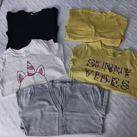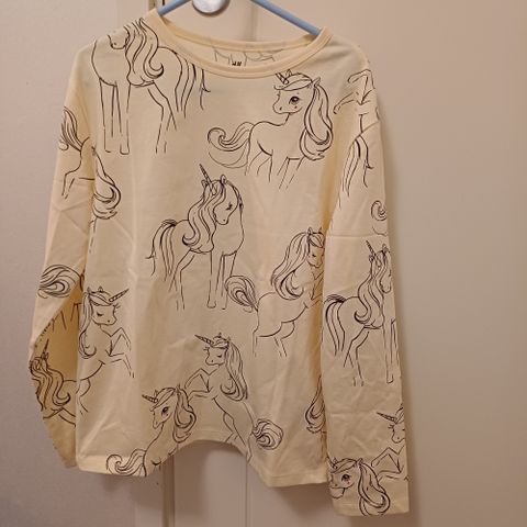 H&M lasten neulepaita tytöille, koko 134/140. Pitkähihainen valkoinen paita, jonka päämateriaalina on puuvilla. Edessä paljetein koristellut yksisarviskuviot. Helmassa on ohut, läpikuultava kerros, joka tuo pieneen helmahameeseen viittaavan ilmeen. Soveltuu arki- ja juhlakäyttöön tytöille noin koossa 134.