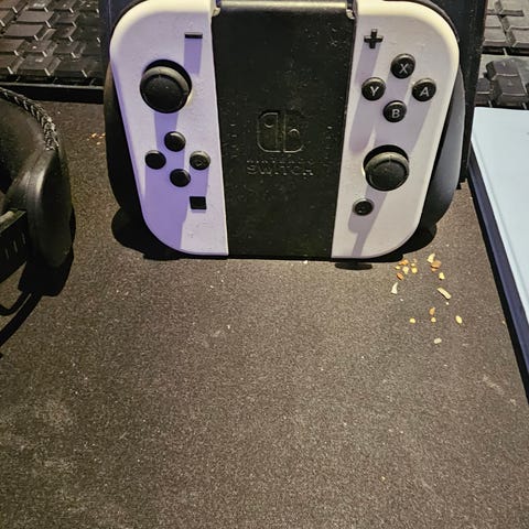 Hyvin vähäiselle käytölle jäänyt Nintendo Switch OLED -pelikonsoli valkoisilla ohjaimilla.