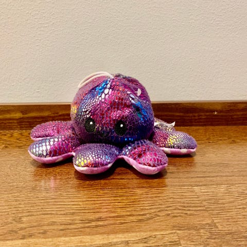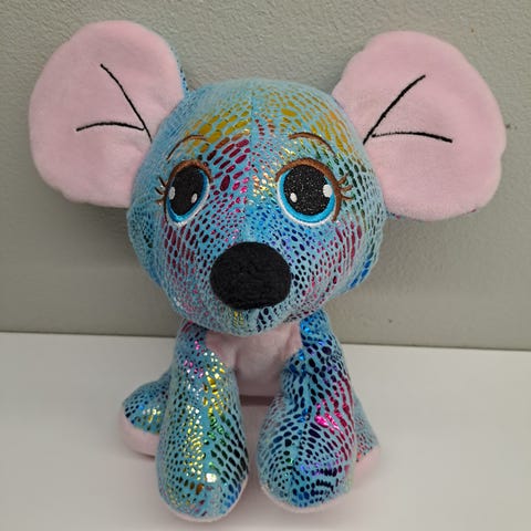 The plush toy is made of shiny, metallic fabric and filled with soft stuffing. Suitable for children's play or as a decoration. Care instructions can be found on the product's care label; do not machine wash.