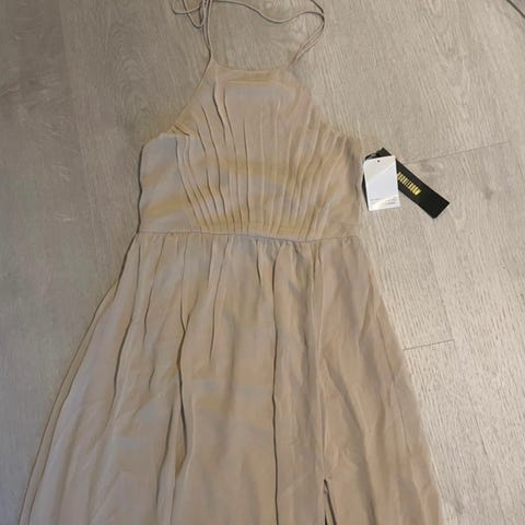 Vastaa kokoa 36. Mallissa on kietaisuvaikutteinen yläosa, V-pääntie ja lyhyet hihat. Helma on pitkä ja laskeutuva halkiolla.