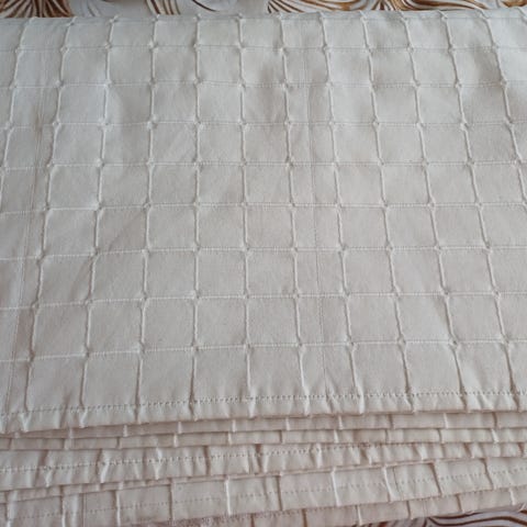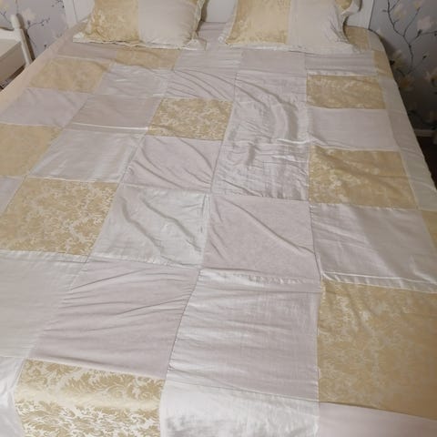 Parisängyn päiväpeitto 216cm x 234cm. 2 kpl tyynynpäällisiä 60cm x 60cm. Tyynynpäällisiä ei ole käytetty koskaan.
