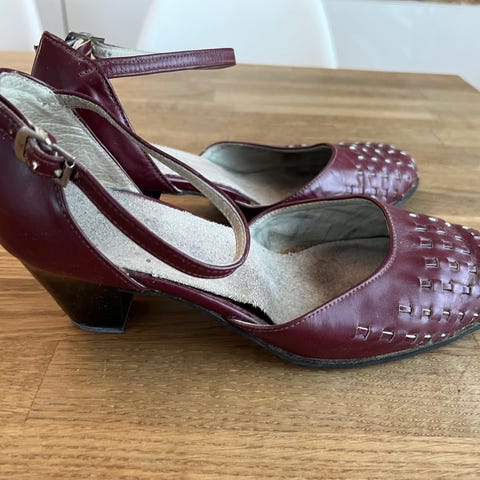 Ostettu ruotsalaisesta vintagemyymälästä tanssikengiksi: sopii vaikka Balboaan tai Lindy Hopiin tai ihan vintagekengiksi. Tanssiessa tullut osumia, mutta edelleen ihan kohtalaisessa kunnossa. Korko 5 cm, kengän pituus n 25 cm