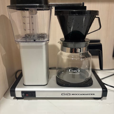 Myydään vähällä käytöllä ollut Moccamaster kahvinkeitin lasikannulla. Laitteessa on musta runko, läpinäkyvä vesisäiliö mitta-asteikolla sekä lasinen kahvikannu muovisella kahvalla. Kahvinkeittimessä on erillinen suodatinosa ja lämpölevy kannun alla.