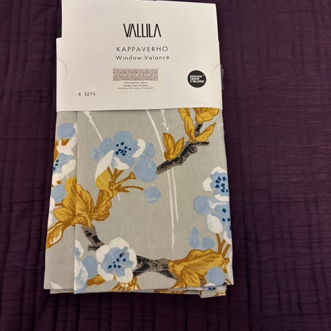 Vallila verho kukkakuosilla. Kankaassa on suuria kukkia ja lehtikuvioita useissa sävyissä. Verhossa on yläreunassa verhonauha ripustusta varten. Sopii käytettäväksi kappaverhona.