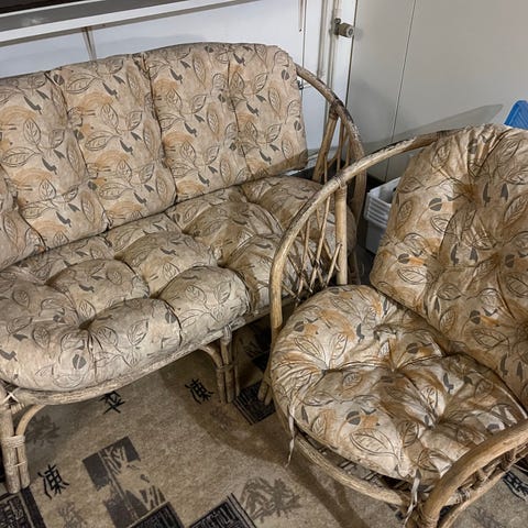 Parolan Rottingin Lumikenkä -rottinkisohva. Parissa kohdassa purkautunut rottinki, ei vaikuta tukevuuteen, kätevä osaa sitoa kohdat kiinni. Käytetty kesäisin katetulla parvekkeella ja talvet ullakolla, nyt lämpimässä varastossa. Kuusi vuotta vanha. Muuton takia tuli tarpeettomaksi.