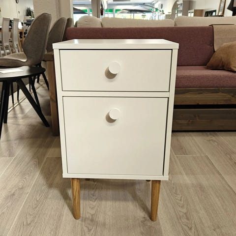 Ajattoman kestävä pikkulipasto sopii yhtä hyvin käytävälle kuin makuuhuoneeseen ja toimi sängyn vieressä yöpöytänä. Laadukkaasta kalustelevystä valmistettu Stemma yöpöytä nousee esiin hienostuneesti puisilla tammijaloillaan, jotka on suunniteltu kestämään aikaa ja käyttöä. Yöpöydässä on valkoiset nuppivetimillä.
