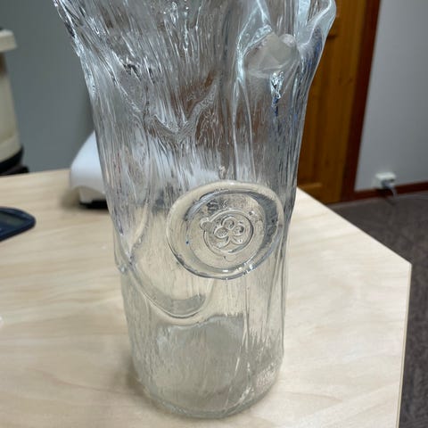 Paksua lasia ja lasissa ilmakuplia yms näkyvissä.