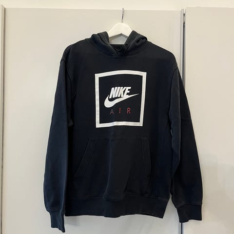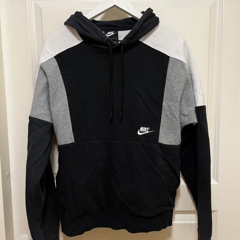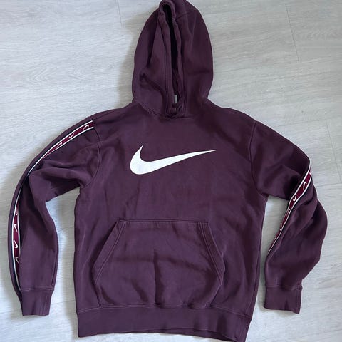 Nike huppari miehille, koko S. Väri valkoinen, edessä sininen Nike-logo ja hihoissa teippikoristeet Nike-teksteillä. Materiaali puuvillaa. Hupussa kiristysnyörit ja edessä kengurutasku. Soveltuu arkikäyttöön ja vapaa-aikaan.