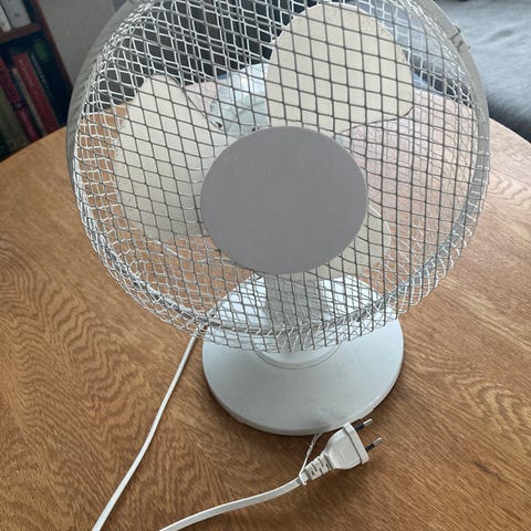 Valkoinen pöytätuuletin sisäkäyttöön. Tuuletin on varustettu suojaverkolla, halkaisija 27 cm.