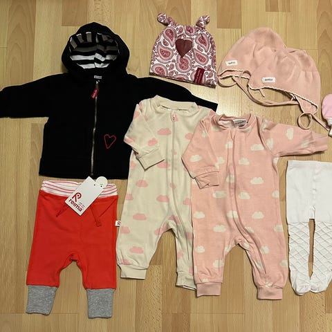 Pieneksi jääneet vauvan vaatteet eteenpäin. Paketissa on jotakuinkin 50 osaa ja laitan mukaan vielä viltin, villasukat sekä muutamat puuvillasukat.