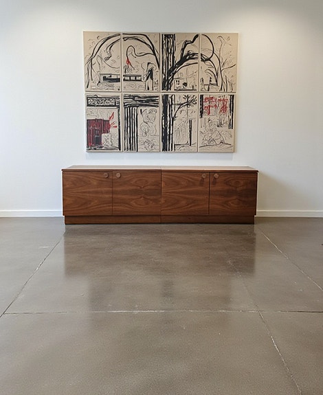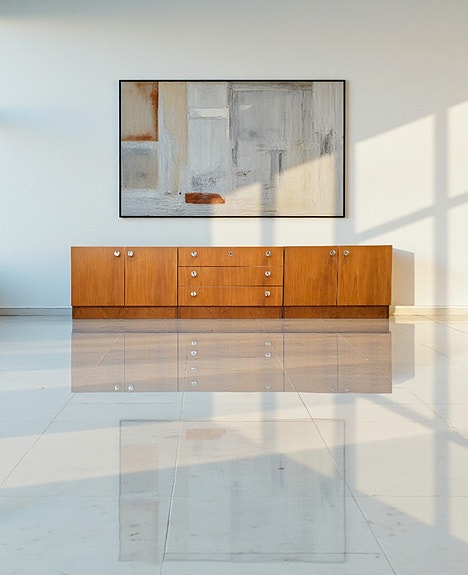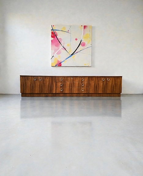 Pitkä, kahdesta osasta koostuva, tammiviilutettu vintage senkki, jossa liukuovet ja kaapit. Kaappeihin löytyy irti otettavat siistit hyllylevyt. Hyllylevyjen korkeutta voi säätää.