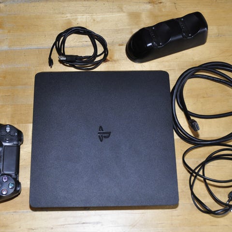 Sony PlayStation 4 -pelikonsoli, väri musta. Tallennustilaa noin 408 GB. On yksi originali ohjain ja vielä joku toinen. On kaikki nauhat paitsi laturi. On hyvässä kuntossa. + on gta 5.